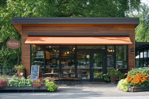 A single-story coffee shop facade in a small American town, reminiscent of Seattle. This charming building features warm, rustic wooden siding and large glass windows that invite passersby in. The entrance is framed by a cozy awning in a rich coffee brown, with a welcoming sign displaying the coffee shop's name in a stylish, handwritten font. Outdoor seating is available on a small patio, adorned with colorful potted flowers and wrought-iron tables and chairs. Inside, large windows allow natural light to flood the space, creating a bright and inviting atmosphere. The scent of freshly brewed coffee wafts through the air, and the ambiance is lively yet relaxed, perfect for socializing or enjoying a quiet moment with a good book. --ar 3:2
