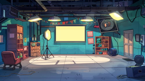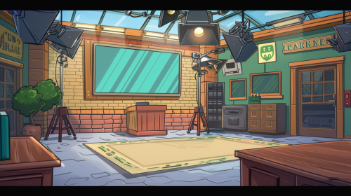 Inside a local small-town warehouse, converted into a quick, portable, 'TV studio', for traveling news reporters, a cartoon animated show background of the interior of the portable studio, hybrid style cartoon graphics in the style of the show, 'ARCANE' a small TV studio from inside, a bright and cheeful setting, background visual, with no peole in the scene, 4K resolution --ar 16:9 --v 6.0