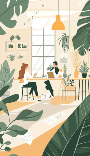 flat vectors ilustration of a energic newspaper office environment with women working and plants and a cat, minimalist, natural light --ar 11:19 --s 50