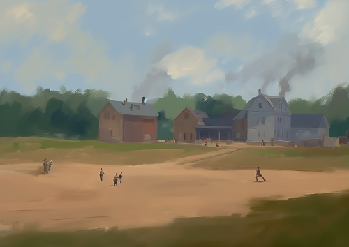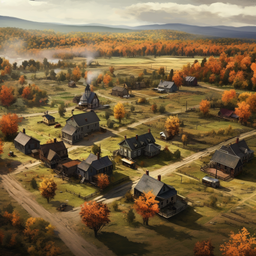 vintage painting: aerial view: a small american town in the fall. matte painting