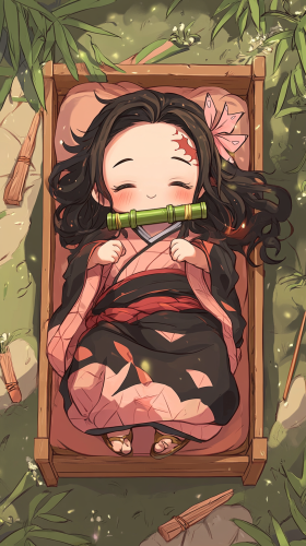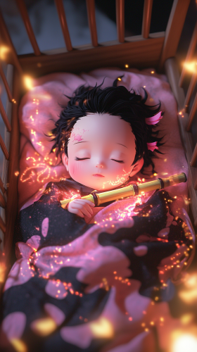 Baby Nezuko from Demon Slayer in an ultra-cute 'uwu' style, peacefully sleeping in a small wooden crib, wrapped in a soft pink and black blanket with tiny bamboo shoot symbols. Her chubby cheeks are blushing, and she has a small bamboo stick in her mouth, just like in the series. A gentle glow of demon energy surrounds her like a protective aura. The crib is surrounded by plush toys shaped like demon slayer tools and bamboo, with pastel colors creating a warm, cozy atmosphere. 8K, HDR, high quality, --ar 9:16