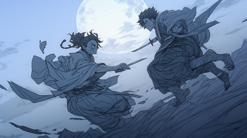 demonslayer stylized drawing of [mugen champloo fighting], warrior fighting on mountaintop, impact frames, monochromatic, action lines, [hyper energy], [intense], detailed, super detailed, ultra detailed, hyper detailed, [power], anime, background of planets, cosmic background, realistic, hyper realistic anime drawing, blue theme, --ar 16:9 --niji 5