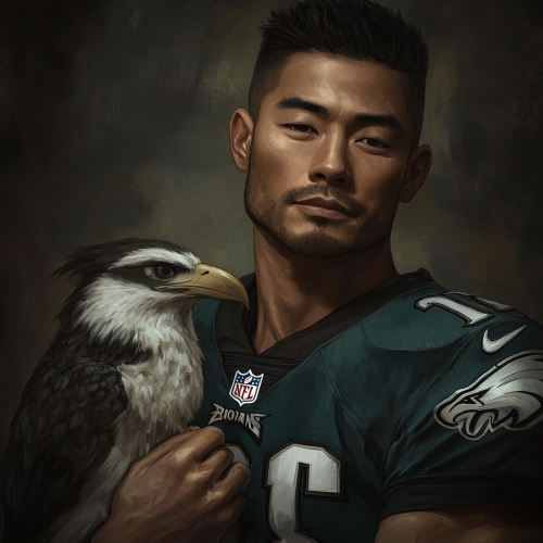 a handsome asian man bids farewell to Alice and wonderland, who is wearing a jersey of NFL team Philadelphia eagles, because he needs to sleep. goodbye!
