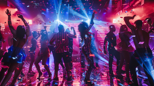 An epic party at a luxurious nightclub, featuring Green Bay Packers NFL players dancing with Brazilian Olympic medalist gymnasts, alongside São Paulo politicians. Neon lights and vibrant lasers flash across the scene, as confetti rains down. Each figure is caught mid-dance, the energy palpable. The background is filled with people cheering, a live DJ spinning in the corner, creating a high-energy atmosphere. Created using: vivid lighting effects, neon glow, dynamic poses, cinematic photography, wide-angle lens, confetti texture, photojournalistic style, vibrant color palette --ar 16:9 --v 6.0