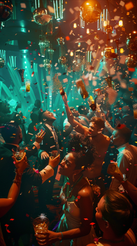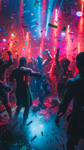An epic party at a luxurious nightclub, featuring Green Bay Packers NFL players dancing with Brazilian Olympic medalist gymnasts, alongside São Paulo politicians. Neon lights and vibrant lasers flash across the scene, as confetti rains down. Each figure is caught mid-dance, the energy palpable. The background is filled with people cheering, a live DJ spinning in the corner, creating a high-energy atmosphere. Created using: vivid lighting effects, neon glow, dynamic poses, cinematic photography, wide-angle lens, confetti texture, photojournalistic style, vibrant color palette --ar 9:16 --v 6.0