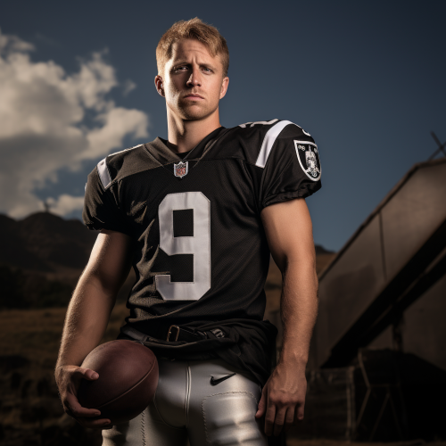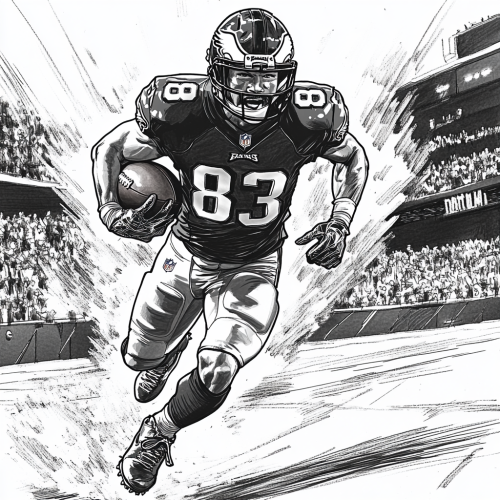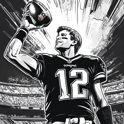 Black and white cartoon-style illustration with bold, thick lines capturing Tom Brady in his New England Patriots uniform, number 12, holding the Lombardi Trophy high in celebration. The background features a subtle timeline of his rise from a 6th-round draft pick to a seven-time Super Bowl champion, with key moments such as his draft day and early struggles integrated into the design. Emphasize his determined expression and iconic stance, showcasing his relentless pursuit of greatness. The illustration should use minimal details but highlight the significant milestones of his journey to becoming one of the NFL’s greatest quarterbacks.