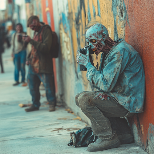 nig city background, zombies blueish rotting skin yellow eyes standing taking photos of a man hurt on the sidewalk curb surreal --style raw --v 6.1 --s 250