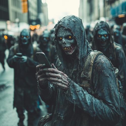 *big city background,close up many zombies blueish rotting skin yellow eyes taking photos with their cellphones of man injured the sidewalk surreal --style raw --v 6.1 --s 250