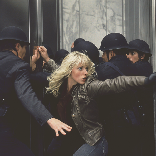 blonde female bank robber fighting with police officers, 1970s, colourised --v 6.0