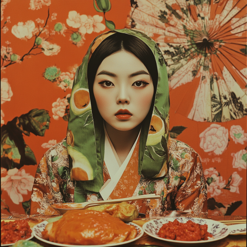 1970s Korean horror creature, lots of kimchi, plates of banchan, Korean folklore, realistic textures, pop surrealism, vintage photography, style of Yayoi Kusama, Korean robe patterned, colors: orange, green, peach