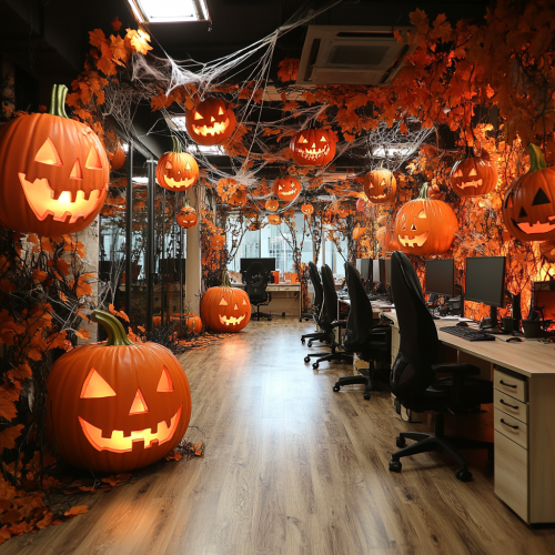 A tastefully decorated office for Halloween. A view of the entire office, the decorations are delicate and there are not too many of them. It should be visible that this is a company that values the friendship and good feeling of its employees. Without pumpkins but with cobwebs and something scary. High quality image, import, what's important is that it looks like a real photo, with mini quads on it --style raw --s 250