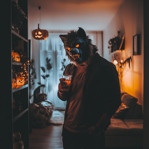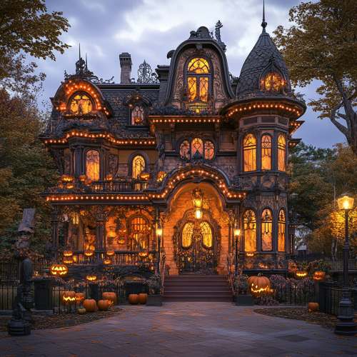 Create a hyper realistic Halloween portrait of a beautiful Victorian Regency Era style home in the style of Thomas Kincaid. The home is heavily decorated outside with lots of spooky decorations and lighting effects. Every year this home decorates for the neighborhood kids and families and give out candies to Trick or treaters. This is a wide shot from the street corner so we see the complete house and entrance fully decorated this Halloween 2024. The owners of this home are very wealthy and have fun decorating their home to look like a spooky and funny Haunted Mansion.