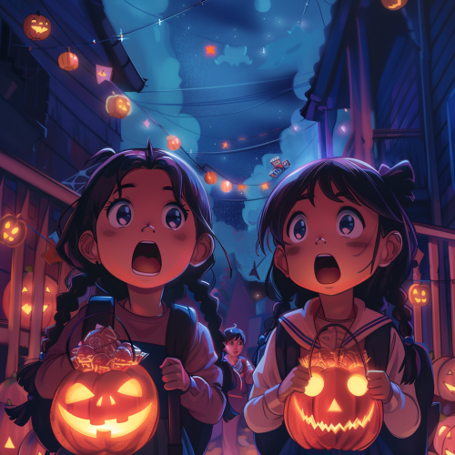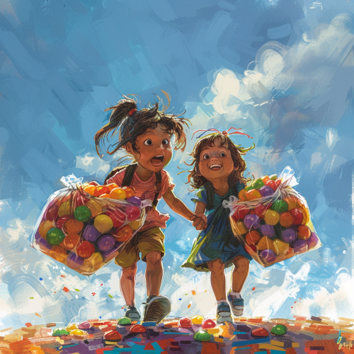 Illustration 4: Nina and Maya with huge candy bags: They’re struggling to carry their nearly overflowing candy bags. Nina’s bag is practically dragging on the ground, and Maya has an excited grin. --s 250 --v 6.0