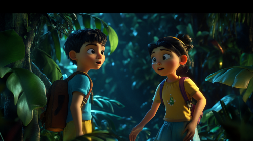 Sally and Mark, two kids in a lively jungle at night, pause their argument and exchange a determined glance. They then dash off in opposite directions, searching for hiding spots. The scene is animated and full of energy, with realistic colors and playful details, capturing the excitement of their Hide-and-Seek game.ultra realistic --ar 16:9