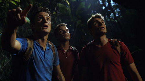 Mark, wearing a blue shirt, excitedly pointing towards the direction of the sound with an enthusiastic expression on his face. Next to him, James, in a red t-shirt, looks hopeful and attentive, his eyes wide with anticipation. They are in the dark jungle at night, with the dense foliage and shadows creating a dramatic backdrop. The moonlight highlights their expressions and casts a soft glow on their surroundings. Animated style, with vivid details and dynamic lighting, capturing the excitement and hopefulness of their moment as they react to the sound. Animated, ultra realistic,. --ar 16:9
