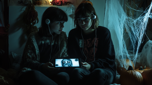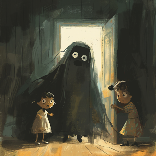 Illustration 3: A creepy shadow at the door: The shadow of Mr. Jenkins in a blanket with eye holes, looking ominous. Nina and Maya clutching each other, looking terrified. --s 250 --v 6.0