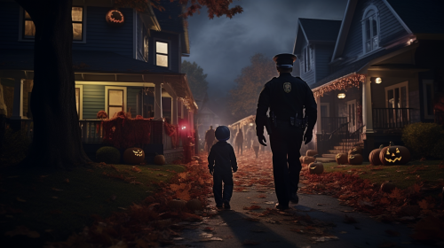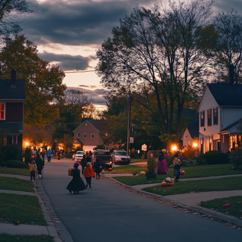 a cinematic photography of a neighborhood on Halloween. Adults and Children are wearing halloween costumes and carrying trick or treat bags or buckets. The time of day is dusk. a Security Guard looks on from the side. --ar 16:9