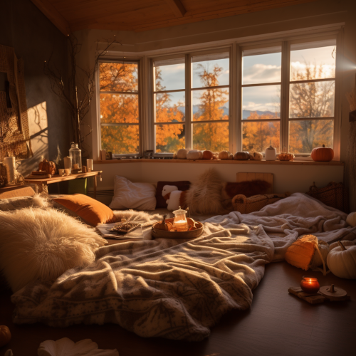 full room photograph of cozy modern mountain retreat at Halloween, morning light, soft blankets strewn on floor --v 5.2