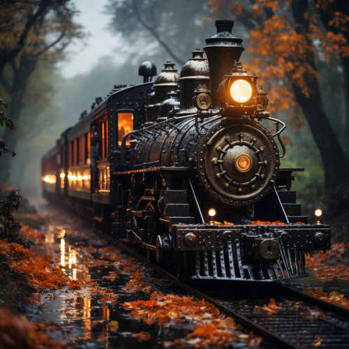 A vibrant Halloween-themed countryside train, adorned with Jack-o'-lanterns and spooky decorations, carrying excited passengers dressed in elaborate costumes, passing through a mist-covered forest with colorful autumn foliage, evoking a sense of wonder and excitement, Photography, using a high-resolution DSLR with a wide-angle lens --s 750 --v 5.2