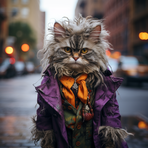 a homeless Persian cat dressed as “The Joker” from Batman for Halloween, trick-or-treating down Sesame Street in Gotham City --s 250 --v 5.2