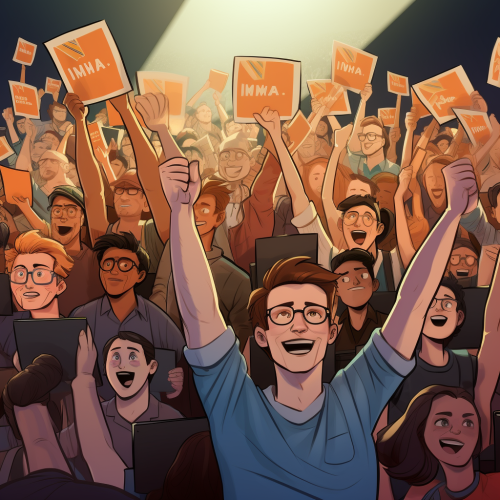 A sea of fans in the audience, holding up signs and cheering. storyboard style
