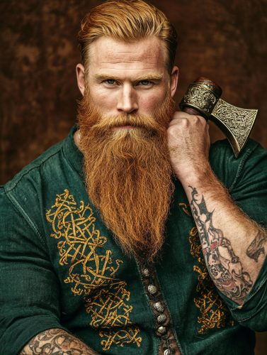 portrait of a viking, norse god Thor, long brown-ginger-ish beard and hair. in his 40s. strongman build, physique wearing dark green viking linen medieval shirt with golden ornaments embroidered with godlen thread. he should look wise yet fearsome and serious, dark brown rustic back drop --ar 3:4
