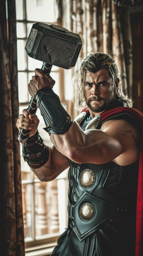 portrait of a viking, norse god Thor, long ginger beard and hair. in his 40s. strongman build with beer belly , wearing dark green viking linen medieval shirt with golden ornaments embroidered with godlen thread. he should look wise yet fearsome and serious, dark brown rustic back drop holding Mjollnir, hamme of thor in one hand and resting it on his shoulder --ar 3:4