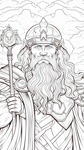 coloring pages for greek god odin, In the style of evil god, sky background with stone temple, Excited Mood, Fine Lines, Low Detail, --ar 9:16 --s 50