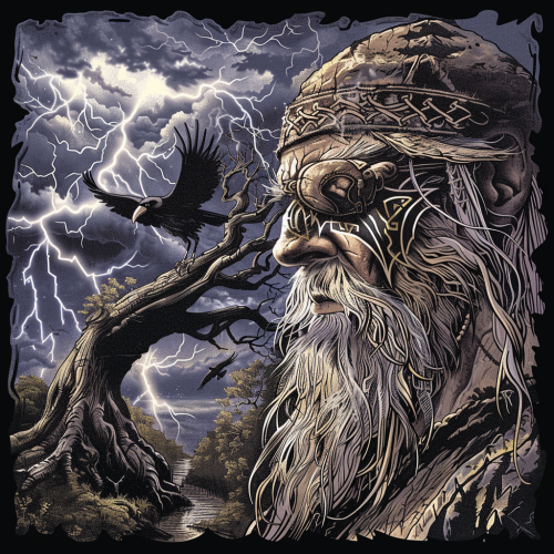 Logo of Norse god Odin, with one eye patch, staring at you, lightning and ravens in the background, near a well and tree, fierce