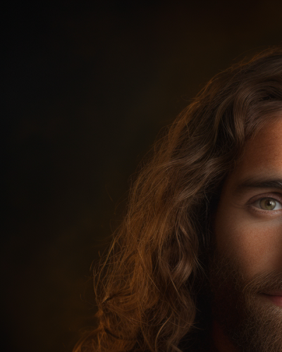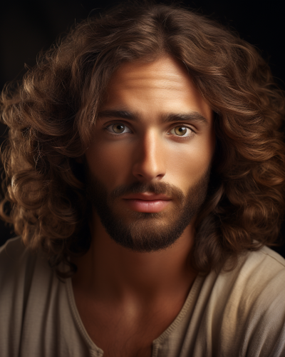 jesus, arab man longer hair is tight curls, no beard, with large ruby stone shining eyes, in the style of portraits with soft lighting, 8k resolution, mark lovett, accurate and detailed, joyful and optimistic, thechamba, tenebrous --ar 51:64
