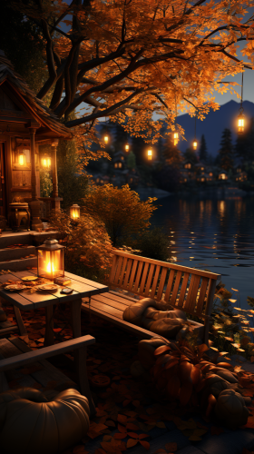 Cozy fall scene, volumetric lighting, 8k, halloween, autumn, cinematic, photorealism, warm, nostalgic --ar 9:16 --s 750