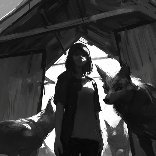 a push-in camera movement of Aunty Aillen stand in front of an clean animal shelter entrance, smilly talked, wearing T shirt, short hair, black and white sketch, eye level, symmetrical structure, facing in front of camera, 16:9 --niji 6