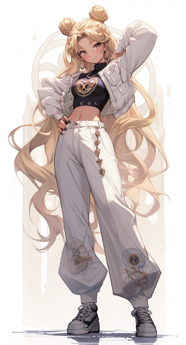 Boujee sailor moon , iced out , diamond teeth, boujee, wearing Jordan shoes, very detailed, detailed background, dynamic poses, realistic body, detailed background --s 250 --niji --ar 14:26