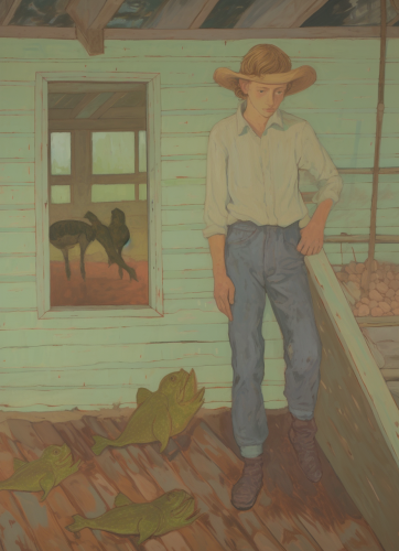 a boy in a cowboy hat mucks out the stable in the morning. Big frogs sleep in the stalls --ar 8:11 --style 74Cxt1BlM3zE