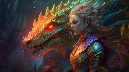 A mythical female warrior, her hands transformed into lethal dragon claws, and her skin replaced by the resplendent scales of a dragon, each scale reflecting the ambient light in a mesmerizing array of colors, Illustration, digital art, --ar 16:9 --v 5.0
