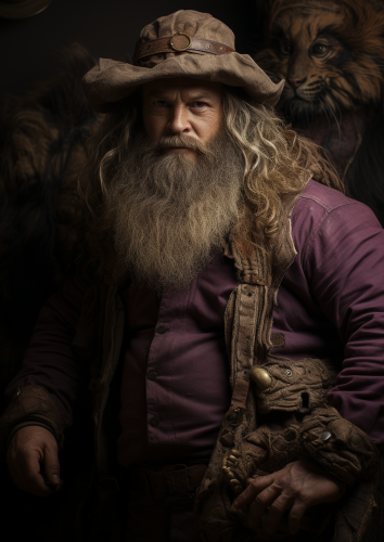 Big muscular hillbilliy with long brown beard and purple hat and overalls fighting a giant tiger gladiator style, movie poster style --ar 5:7 --s 750