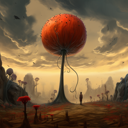 "A man in a black Amish style suit with a wide-brimmed hat and black gloves, shown from a behind and side angle, stands in a sunflower field. He is carefully picking a solitary seed from the face of a tall sunflower that is at eye level with him. The scene is waist-up, with dozens of towering sunflowers surrounding him to the left, right, and rear. The lighting is dramatic, casting deep shadows. The color palette is muted and earthy, with dark greens, yellows, and blacks. The mood is eerie and unsettling, with detailed linework in the style of Bernie Wrightson’s classic horror comics. v6 4k ar 2:4"