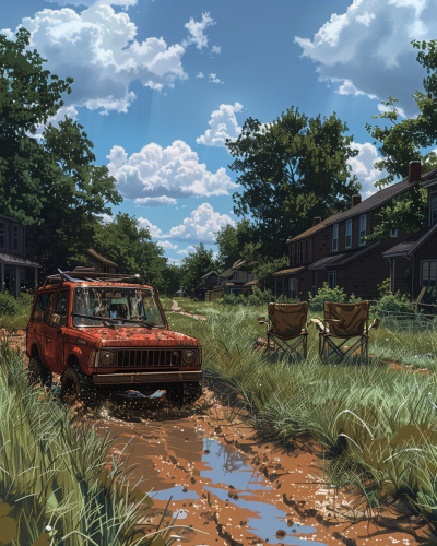 a high resolution cartoon style illustration of A rugged off-road vehicle splashing through a muddy trail on the edge of the neighborhood, past rows of freshly built homes. The trail leads to a secluded picnic spot, where folding chairs are set up beside a rusting barbecue grill , blue sky, white clouds, afternoon, rendered in a colorful cartoon style, with bright colors and clear lines , well detailed, colorful, eye pleasing --ar 4:5 --s 500 --v 6.0 --chaos 20