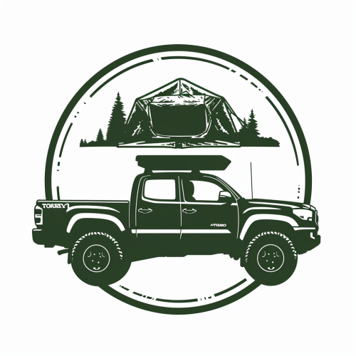 a one color vector logo on a white background, for the brand Brooklyn-Overland. Classic and adventurous and aimed at offroad community in dark green. The logo should incorporate elements that convey a sense of exploration, ruggedness, and the midway point of a journey. Atleast include a Toyota pickup truck with canopy and rooftop tent. Consider including symbols like mountains, trees. Ensure the design is scalable, versatile, and visually appealing. Emphasize the spirit of adventure and the company's commitment to providing memorable off-road experiences. --v 6.0