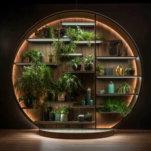 integrated display box in circle shapea , the wall in wooden panels cladding, hidden lights under shelves , side view shot from office corridor, the display box border in metal color brown, some plants on shelves, some moos green colors