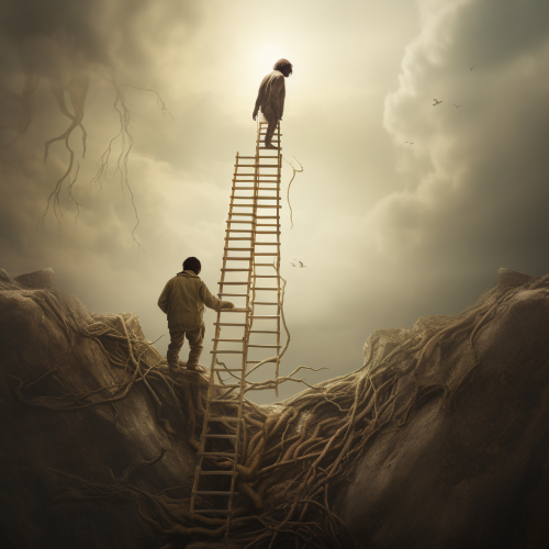 A large corporate ladder is depicted stretching into the clouds. Maya is seen climbing the ladder, but each rung is made up of different ethical challenges --ar 9:16 --v 6.1