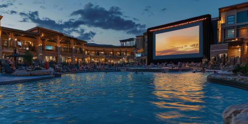 contemporary movie theater playing old film, dark blue textile walls, dark purple seats, linear lights cealing, --ar 16:9