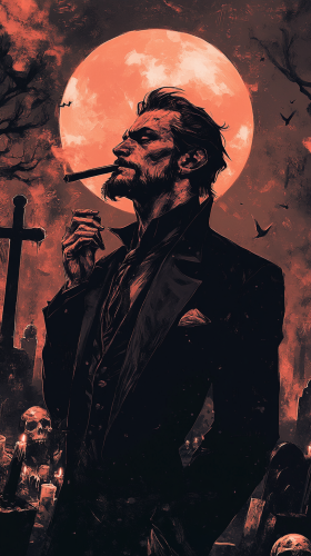 early 1900s horror comic art, the camera angle is pointing over a man's shoulder, the man is pointing at a screen, on the screen is displayed a rough rendering of a man being confronted by a large monstrous Dog Man outside a moonlit cemetery, the Dog Man is awkward looking and stands on his hind feet upright, --ar 4:3 --style raw
