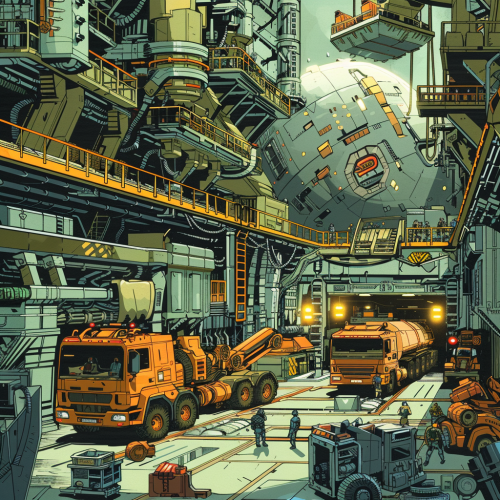 sci-fi facility with futuristic heavy vehicles, trucks, cars and people. comic book art style