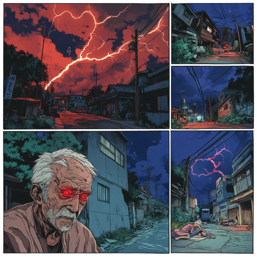 A comic book-style depiction of an older man with short, gray hair and a beard, standing in front of a cemetery at night and looking to his left side. --ar 9:16
