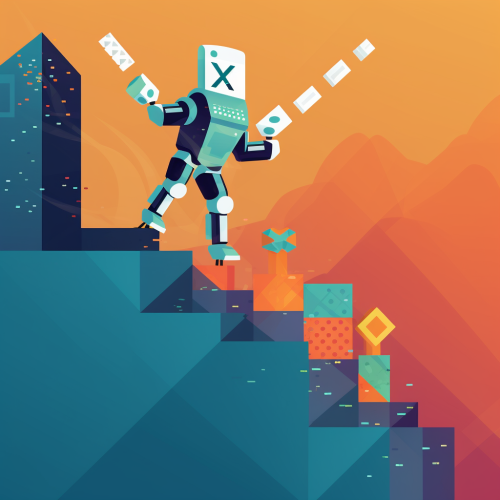 0xBot logo showcasing a robot character climbing a staircase made of trading signals, the '0x' symbol prominently displayed at the top, bright and inviting colors to evoke success and ambition, illustration, motivational vector art, --ar 1:1 --v 5.0