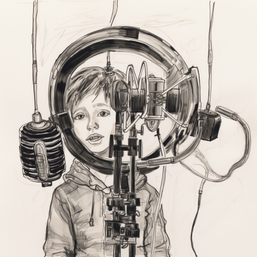 a bad hand drawing made by a seven year old kid, black and white of a Neumann U-87 condenser microhphone mounted on its shockmount, pencil draw only the outline , shaky, kids style.