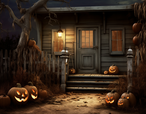 halloween trick or treat, old house with old wooden door and pumpkins outside, in old folk art style illustrations, sepia and dark tones, --ar 90:70