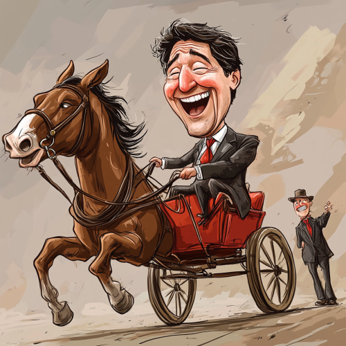 political cartoons style, canadian prime minister justin trudeau is laughing on carriage and one tied horse hardly able pull him and hardly walking. Few people around him frustrated and tired.