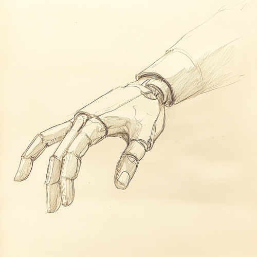 sketch the wrist of a person, just one wrist in view, iso view, slightly open grip with the bottom of the wrist facing down. with a curved peice of metal bending oposite to the fingers, attached to at the wrist